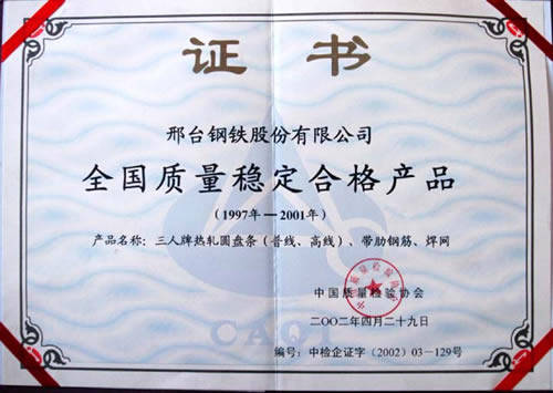 三人牌熱軋圓盤條、帶肋鋼筋、焊網(wǎng)獲全國(guó)質(zhì)量穩(wěn)定合格產(chǎn)品