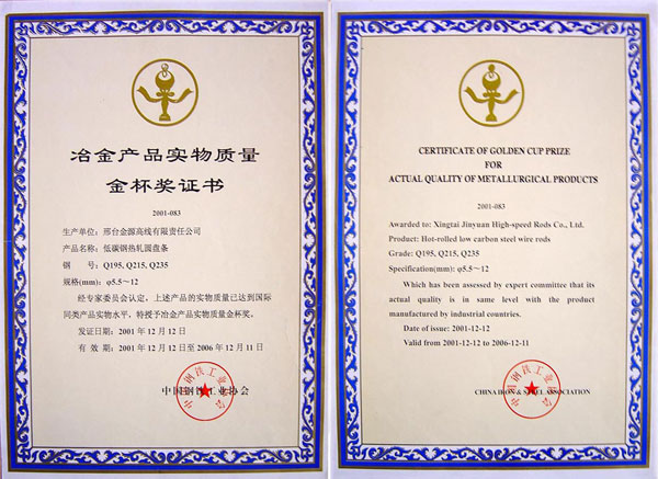 低碳鋼熱軋圓盤條Q195,Q215,Q235獲冶金產(chǎn)品實(shí)物質(zhì)量金杯獎(jiǎng)