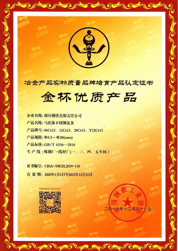 邢鋼馬氏體不銹鋼盤條06Cr13、12Cr13、20Cr13、Y12Cr13 φ5.5-28mm規(guī)格獲冶金產(chǎn)品實物質(zhì)量金杯優(yōu)質(zhì)產(chǎn)品認定證書