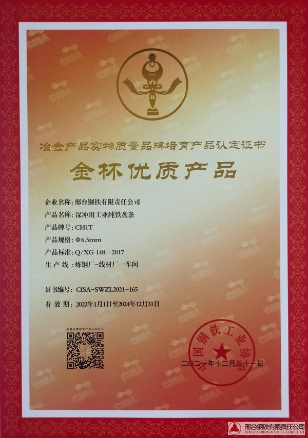 深沖用工業(yè)純鐵盤條CH1Tφ6.5mm規(guī)格獲冶金產(chǎn)品實物質(zhì)量金杯優(yōu)質(zhì)產(chǎn)品認定證書