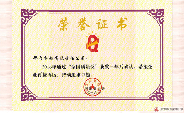 邢鋼于2013年獲得全國(guó)質(zhì)量獎(jiǎng),獲獎(jiǎng)后邢鋼繼續(xù)實(shí)踐《卓越績(jī)效評(píng)價(jià)準(zhǔn)則》,深入推進(jìn)卓越績(jī)效管理模式,持續(xù)改進(jìn),不斷追求卓越。2016年9月全國(guó)質(zhì)量獎(jiǎng)評(píng)審活動(dòng)領(lǐng)導(dǎo)小組組織專家對(duì)邢鋼進(jìn)行了全國(guó)質(zhì)量獎(jiǎng)獲獎(jiǎng)三年后的現(xiàn)場(chǎng)確認(rèn),通過專家小組的現(xiàn)場(chǎng)提問、材料匯報(bào)、生產(chǎn)現(xiàn)場(chǎng)的參觀,邢鋼順利通過了“全國(guó)質(zhì)量獎(jiǎng)”獲獎(jiǎng)三年后確認(rèn)并頒發(fā)證書。