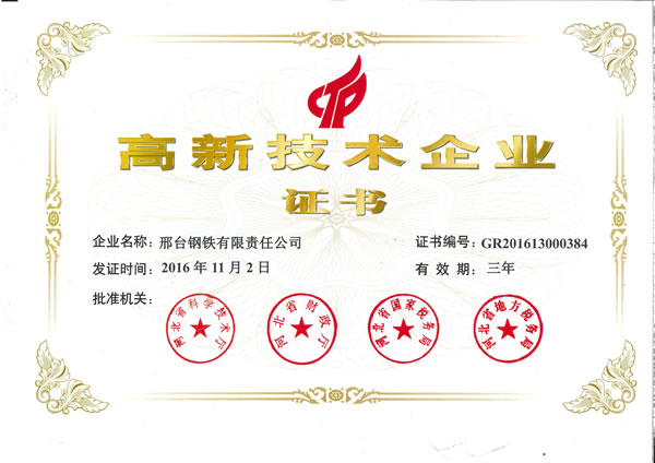 2016年11月2日,邢鋼再次被評(píng)為河北省“高新技術(shù)企業(yè)”,這是繼2013年之后連續(xù)第二次獲此榮譽(yù)。