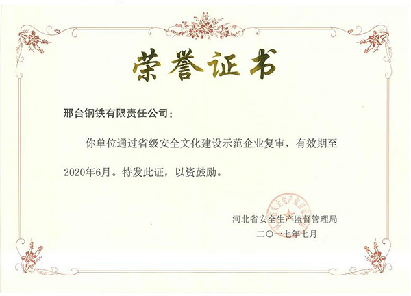 2014年,邢鋼安全文化建設(shè)取得初步成果,首批獲得“省級(jí)安全文化建設(shè)示范企業(yè)”。2017年7月,邢鋼順利通過復(fù)審再獲“省級(jí)安全文化建設(shè)示范企業(yè)”。
