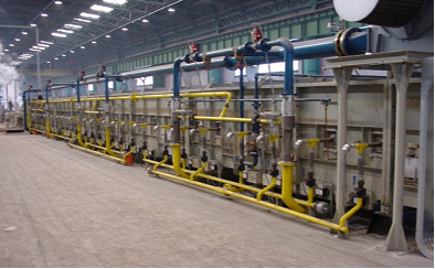 4、索氏體化淬火:采用熔融的鉛作為淬火劑,在600℃左右完成鋼絲組織由奧實體化向索氏體化的轉(zhuǎn)變。采用燃氣分二段供熱,各段單獨控溫,根據(jù)鉛溫要求及時調(diào)整供熱負荷。