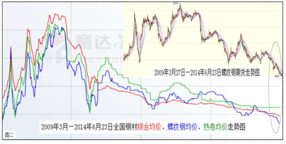 底線的提高,勢必助推中國經(jīng)濟大勢呈現(xiàn)前低后高的走勢。而經(jīng)過長期低迷的中國鋼材市場,也已經(jīng)具備逐漸走強的兩大要素:一是鋼市走強的外在環(huán)境趨好(見上圖一)。包括上半年推出一系列微刺激效應逐漸顯現(xiàn),下半年由于經(jīng)濟增長底線提高,以及持續(xù)加推的動力措施等合成發(fā)酵,定會形成遠比上半年良好的鋼市發(fā)展環(huán)境;二是鋼市走強的內在動能充沛(下圖二)。鋼材價格經(jīng)過長期下跌后,已經(jīng)下穿了所有的技術阻力位,使業(yè)內根本無法從技術面進行詮釋。但從價值規(guī)律、市場規(guī)律以及基本面情況看,目前鋼材價格的底部特征已經(jīng)十分明顯,空方量能也已近衰竭。因此,經(jīng)過短時間的整固蓄勢后,震蕩上揚應該是后期運行的主基調。如果再結合宏觀上經(jīng)濟增長底線的提高,下半年鋼材價格恢復性上揚既在情理之中,也是勢所必然。所以,基于經(jīng)濟和鋼市大勢筆者作出,下半年全國鋼材價格勢必高于上半年的預測。