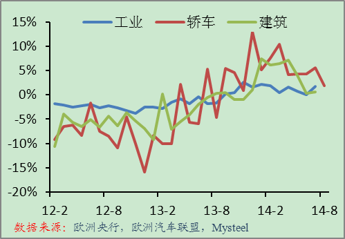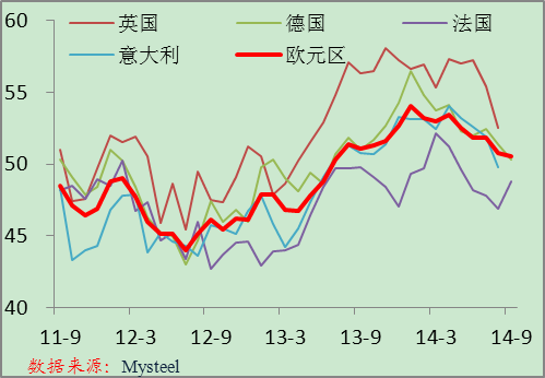 歐元區(qū)9月制造業(yè)PMI初值為50.5%,連續(xù)5個(gè)月環(huán)比下降,表明歐元區(qū)經(jīng)濟(jì)增長(zhǎng)依舊低迷,加之當(dāng)前歐元區(qū)低通脹未見起色,預(yù)計(jì)經(jīng)濟(jì)低增長(zhǎng)可能在一段時(shí)間內(nèi)為歐元區(qū)經(jīng)濟(jì)的常態(tài)。目前歐洲央行采取逐步放寬政策的措施來改善歐元區(qū)信貸,但從當(dāng)前來看,并沒有多大改善,預(yù)計(jì)歐洲央行將進(jìn)一步放寬政策以挽救歐元區(qū)經(jīng)濟(jì)。但即便如此,在財(cái)政改革遲緩的情況下,貨幣政策對(duì)于經(jīng)濟(jì)的刺激效果不大。從歐洲下游行業(yè)的表現(xiàn)看,增長(zhǎng)速度也是連續(xù)下滑。