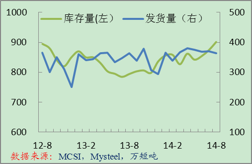 8月末美國(guó)金屬服務(wù)中心的鋼材庫存達(dá)到901.4萬短噸,環(huán)比增長(zhǎng)3.1%,同比增長(zhǎng)13.5%,創(chuàng)兩年來最高水平。8月份美國(guó)服務(wù)中心的發(fā)貨量為364萬短噸,同比略微增長(zhǎng),環(huán)比下降1.7%。按照供應(yīng)天數(shù)計(jì)算,8月末的鋼材庫存為2.5個(gè)月供應(yīng)量,7月末為2.4個(gè)月供應(yīng)量。2013年8月末為2.2個(gè)月供應(yīng)量。