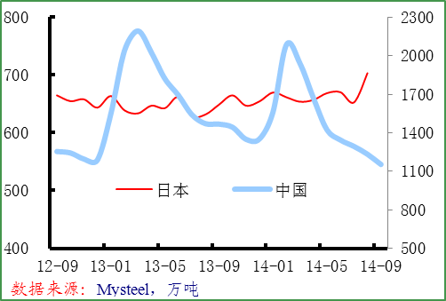 9月份中國(guó)流通環(huán)節(jié)鋼材庫存繼續(xù)下降,9月底全國(guó)主要鋼的社會(huì)庫存為1154萬噸,比8月底下降80萬噸,較去年同期下降314萬噸,鋼廠價(jià)格大幅下滑,貿(mào)易商加大了去庫存力度。中鋼協(xié)統(tǒng)計(jì)數(shù)據(jù)顯示,9月中旬末重點(diǎn)鋼企鋼材庫存為1590萬噸,較8月中旬末增長(zhǎng)65萬噸,全國(guó)重點(diǎn)鋼廠鋼廠庫存連續(xù)兩個(gè)月增長(zhǎng)。日本國(guó)內(nèi)庫存大幅上升,8月末全國(guó)鋼材庫存為703萬噸,創(chuàng)10年來最高水平,鋼廠庫存增長(zhǎng)明顯,市場(chǎng)需求難以消化供應(yīng)。