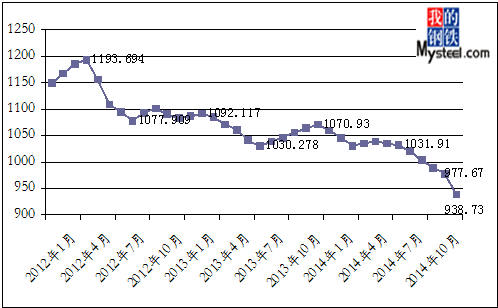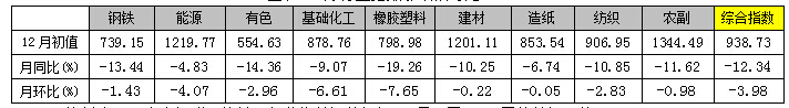 2014年12月份,上海鋼聯(lián)大宗商品價(jià)格指數(shù)(MyBCIC)初值為938.73,同比下跌了12.34%;環(huán)比下跌了3.98%,同環(huán)比跌幅繼上月均有所擴(kuò)大。