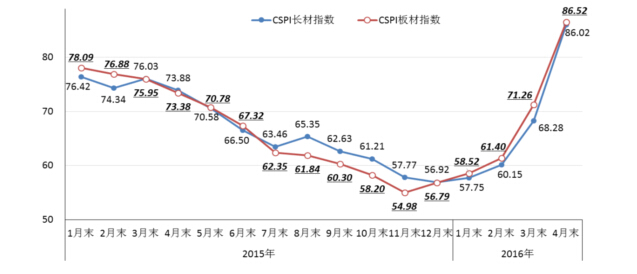 4月末,CSPI長(zhǎng)材指數(shù)為86.02點(diǎn),環(huán)比上升17.74點(diǎn),升幅為25.98%,較上月加大12.46個(gè)百分點(diǎn);CSPI板材指數(shù)為86.52點(diǎn),環(huán)比上升15.26點(diǎn),升幅為21.41%,較上月加大5.35個(gè)百分點(diǎn),比長(zhǎng)材價(jià)格升幅低4.57個(gè)百分點(diǎn);與去年同期相比,長(zhǎng)材指數(shù)上升12.14點(diǎn),升幅為16.43%;板材指數(shù)上升13.14點(diǎn),升幅為17.91%。(見(jiàn)下圖、下表)