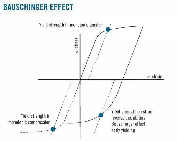 金屬材料經(jīng)過預(yù)先加載產(chǎn)生少量塑性變形(殘余應(yīng)變?yōu)?%~2%),卸載后再同向加載,規(guī)定殘余應(yīng)力(彈性極限或屈服強(qiáng)度 )增加;反向加載,規(guī)定殘余應(yīng)力降低(特別是彈性極限在反向加載時(shí)幾乎降低到零)的現(xiàn)象,稱為包申格效應(yīng)。
