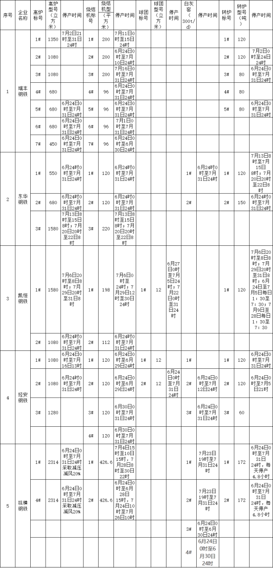 1、燒結機:1#92.4㎡燒結機6月24日0時至7月10日16時停產、7月13日0時至7月31日8時停產(1#燒結機停產35天);2#92.4㎡燒結機6月24日0時至7月12日24:00時停產(2#燒結機停產19天);3#92.4㎡燒結機7月10日0時至7月12日24:00時停產(3#燒結機停產3天)。其余時間正常生產。