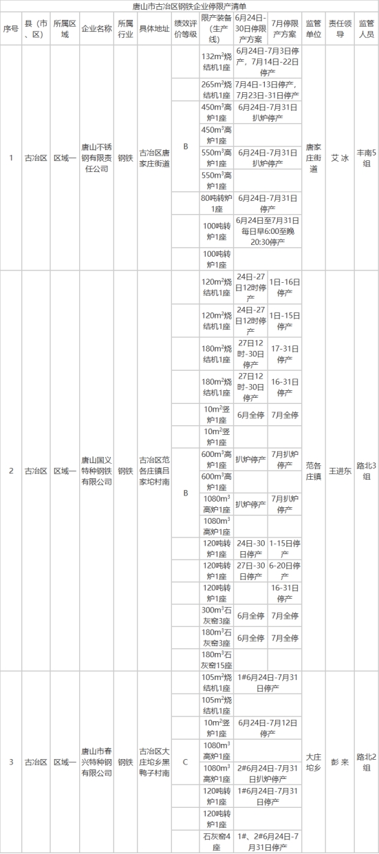 唐山市古冶區(qū)鋼鐵企業(yè)停限產清單