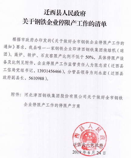 唐山遷西縣人民政府關于鋼鐵企業(yè)停限產工作的清單