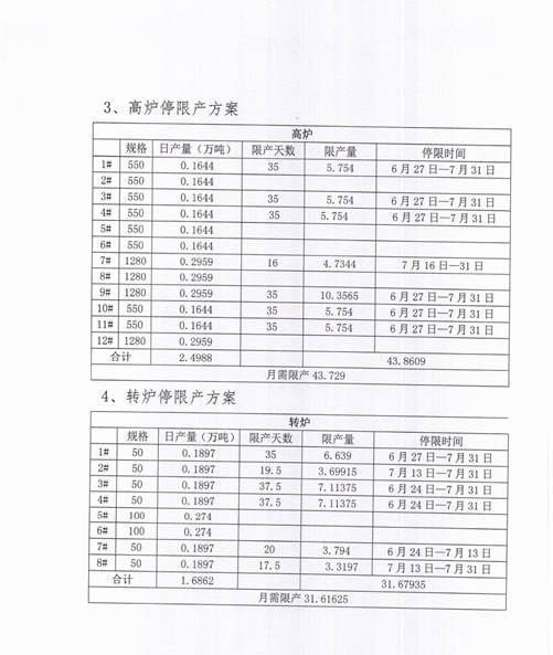 1、高爐限產50%,6月25日0時—7月12日12時停產,7月12日12時—7月31日正常生產,共停機17.5天。