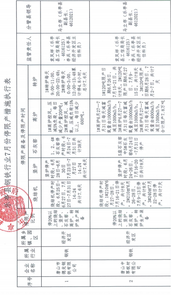 唐山樂亭縣鋼鐵企業(yè)7月份停限產措施執(zhí)行表