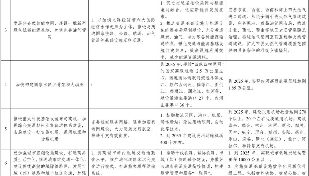 中央財(cái)經(jīng)委員會(huì)第十一次會(huì)議要求內(nèi)容與中共中央、國務(wù)院印發(fā)的《交通強(qiáng)國建設(shè)綱要》《國家綜合立體交通網(wǎng)規(guī)劃綱要》《“十四五”現(xiàn)代綜合交通運(yùn)輸體系發(fā)展規(guī)劃》等政策文件一脈相承,并有所側(cè)重,強(qiáng)化了交通、能源、水利、城鎮(zhèn)和科技等基礎(chǔ)設(shè)施在國內(nèi)國際雙循環(huán)相互促進(jìn)過程中的重要紐帶作用和產(chǎn)業(yè)鏈供應(yīng)鏈安全穩(wěn)定的保障基石作用,對(duì)構(gòu)建現(xiàn)代化基礎(chǔ)設(shè)施體系、推動(dòng)經(jīng)濟(jì)高質(zhì)量發(fā)展具有重要指導(dǎo)意義。同時(shí),兼顧了有序推進(jìn)地下綜合管廊建設(shè),加強(qiáng)城市防洪排澇、污水和垃圾收集處理體系建設(shè),加強(qiáng)防災(zāi)減災(zāi)基礎(chǔ)設(shè)施、公共衛(wèi)生應(yīng)急設(shè)施和國家安全基礎(chǔ)設(shè)施建設(shè);推進(jìn)重點(diǎn)水源、灌區(qū)、蓄滯洪區(qū)建設(shè)和現(xiàn)代化改造等內(nèi)容。表1為中央財(cái)經(jīng)委員會(huì)第十一次會(huì)議基礎(chǔ)設(shè)施建設(shè)有關(guān)內(nèi)容與相關(guān)政策文件對(duì)照。
