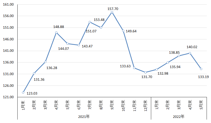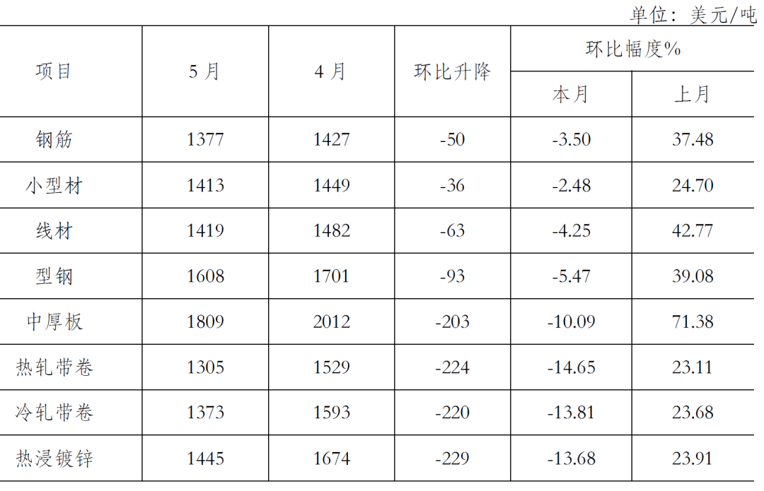 5月末,CIOPI進(jìn)口礦價(jià)格環(huán)比下降5.28美元/噸,國(guó)產(chǎn)鐵精礦價(jià)格環(huán)比下降67元/噸;煉焦煤價(jià)格環(huán)比下降600元/噸,冶金焦價(jià)格環(huán)比下降733元/噸,廢鋼價(jià)格環(huán)比下降150元/噸。原燃料價(jià)格雖環(huán)比回落,但總體仍處于高位。(見(jiàn)下表)