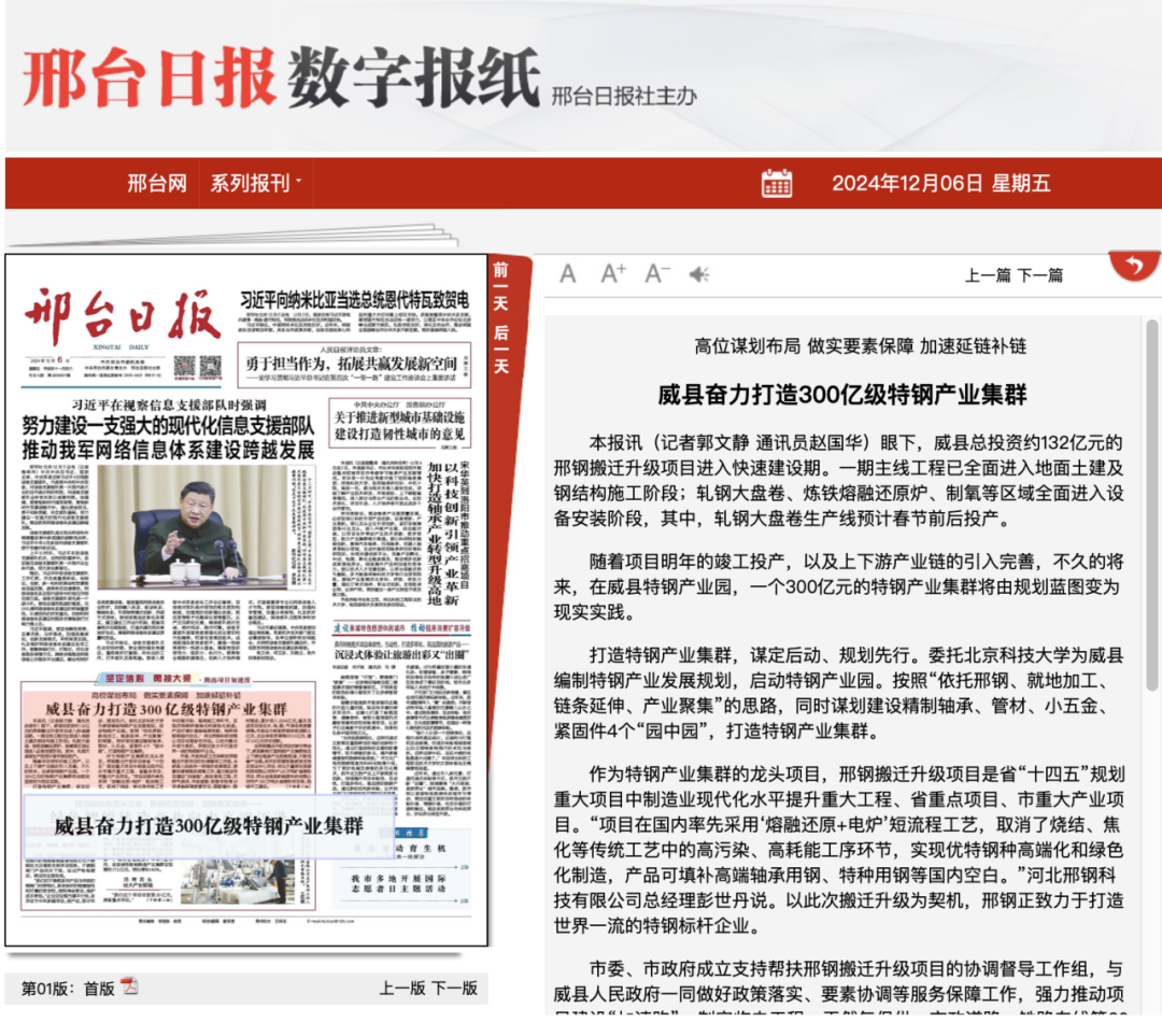 隨著項目明年的竣工投產(chǎn),以及上下游產(chǎn)業(yè)鏈的引入完善,不久的將來,在威縣特鋼產(chǎn)業(yè)園,一個300億元的特鋼產(chǎn)業(yè)集群將由規(guī)劃藍圖變?yōu)楝F(xiàn)實實踐。