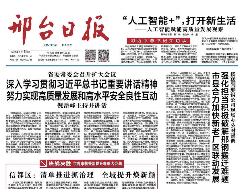 2月14日,市委書記楊猛到邢鋼公司現(xiàn)場(chǎng)辦公,強(qiáng)調(diào)要深入落實(shí)省委、省政府相關(guān)工作要求,搶抓政策機(jī)遇、積極擔(dān)當(dāng)作為,創(chuàng)新融資方式、強(qiáng)化要素保障,市縣合力加快邢鋼新廠區(qū)和老廠區(qū)搬遷聯(lián)動(dòng)發(fā)展,以強(qiáng)有力項(xiàng)目支撐助推全市跨越趕超發(fā)展。副市長李亞林參加并講了意見。