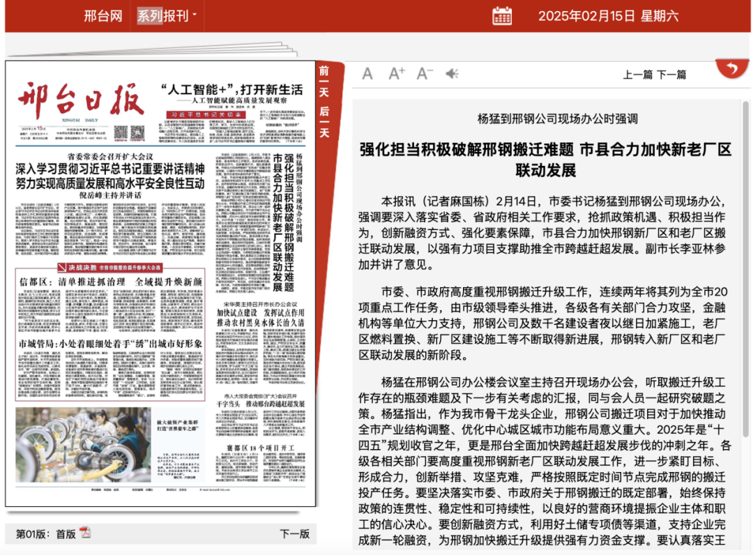 楊猛在邢鋼公司辦公樓會(huì)議室主持召開現(xiàn)場(chǎng)辦公會(huì),聽取搬遷升級(jí)工作存在的瓶頸難題及下一步有關(guān)考慮的匯報(bào),同與會(huì)人員一起研究破題之策。楊猛指出,作為我市骨干龍頭企業(yè),邢鋼公司搬遷項(xiàng)目對(duì)于加快推動(dòng)全市產(chǎn)業(yè)結(jié)構(gòu)調(diào)整、優(yōu)化中心城區(qū)城市功能布局意義重大。2025年是“十四五”規(guī)劃收官之年,更是邢臺(tái)全面加快跨越趕超發(fā)展步伐的沖刺之年。各級(jí)各相關(guān)部門要高度重視邢鋼新老廠區(qū)聯(lián)動(dòng)發(fā)展工作,進(jìn)一步緊盯目標(biāo)、形成合力,創(chuàng)新舉措、攻堅(jiān)克難,嚴(yán)格按照既定時(shí)間節(jié)點(diǎn)完成邢鋼的搬遷投產(chǎn)任務(wù)。要堅(jiān)決落實(shí)市委、市政府關(guān)于邢鋼搬遷的既定部署,始終保持政策的連貫性、穩(wěn)定性和可持續(xù)性,以良好的營商環(huán)境提振企業(yè)主體和職工的信心決心。要?jiǎng)?chuàng)新融資方式,利用好土儲(chǔ)專項(xiàng)債等渠道,支持企業(yè)完成新一輪融資,為邢鋼加快搬遷升級(jí)提供強(qiáng)有力資金支撐。要認(rèn)真落實(shí)王正譜省長在邢臺(tái)現(xiàn)場(chǎng)辦公會(huì)相關(guān)要求,全力加快威縣邢鋼鐵路專用線專項(xiàng)債項(xiàng)目,推動(dòng)邯黃鐵路威縣專線及貨運(yùn)中心項(xiàng)目建設(shè),切實(shí)降低邢鋼公司物流成本。要堅(jiān)持片區(qū)開發(fā)思維,啟動(dòng)邢鋼老廠區(qū)及周邊區(qū)域綜合利用、招商引資、工業(yè)遺產(chǎn)開發(fā)等規(guī)劃設(shè)計(jì),實(shí)現(xiàn)現(xiàn)有資源的有效盤活利用。邢鋼公司要堅(jiān)定信心,千方百計(jì)推進(jìn)搬遷升級(jí)項(xiàng)目早投產(chǎn)、早見效,在項(xiàng)目建設(shè)中當(dāng)先鋒、挑大梁,為投資消費(fèi)質(zhì)效年貢獻(xiàn)力量。