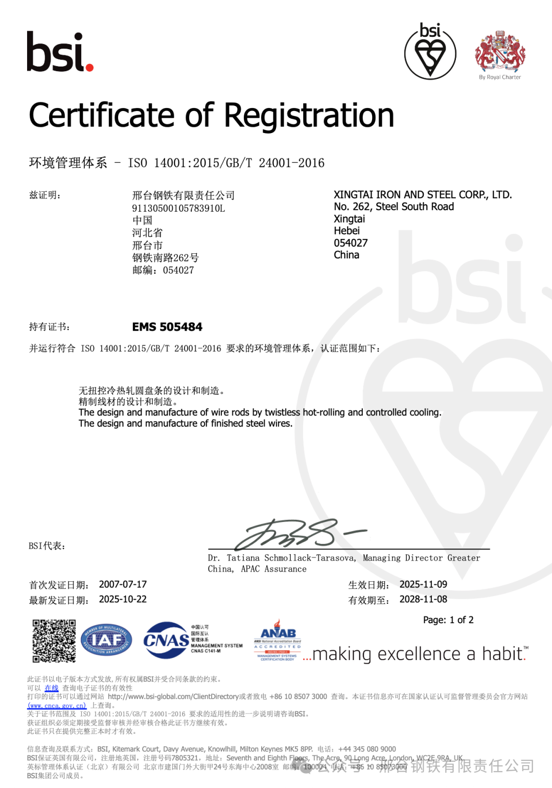 Recently, Xingtai Iron and Steel Co., Ltd. (hereinafter referred to as "Xingtai Steel") successfully passed the recertification audit of its Occupational Health and Safety Management System and Environmental Management System conducted by the British Standards Institution (BSI), and obtained the new version of the certification certificates. Since first obtaining the system certification in 2007, the company has maintained the continuous and effective operation of the systems for 18 consecutive years, demonstrating its long-term and stable compliance capability and management resilience in safety and environmental management.