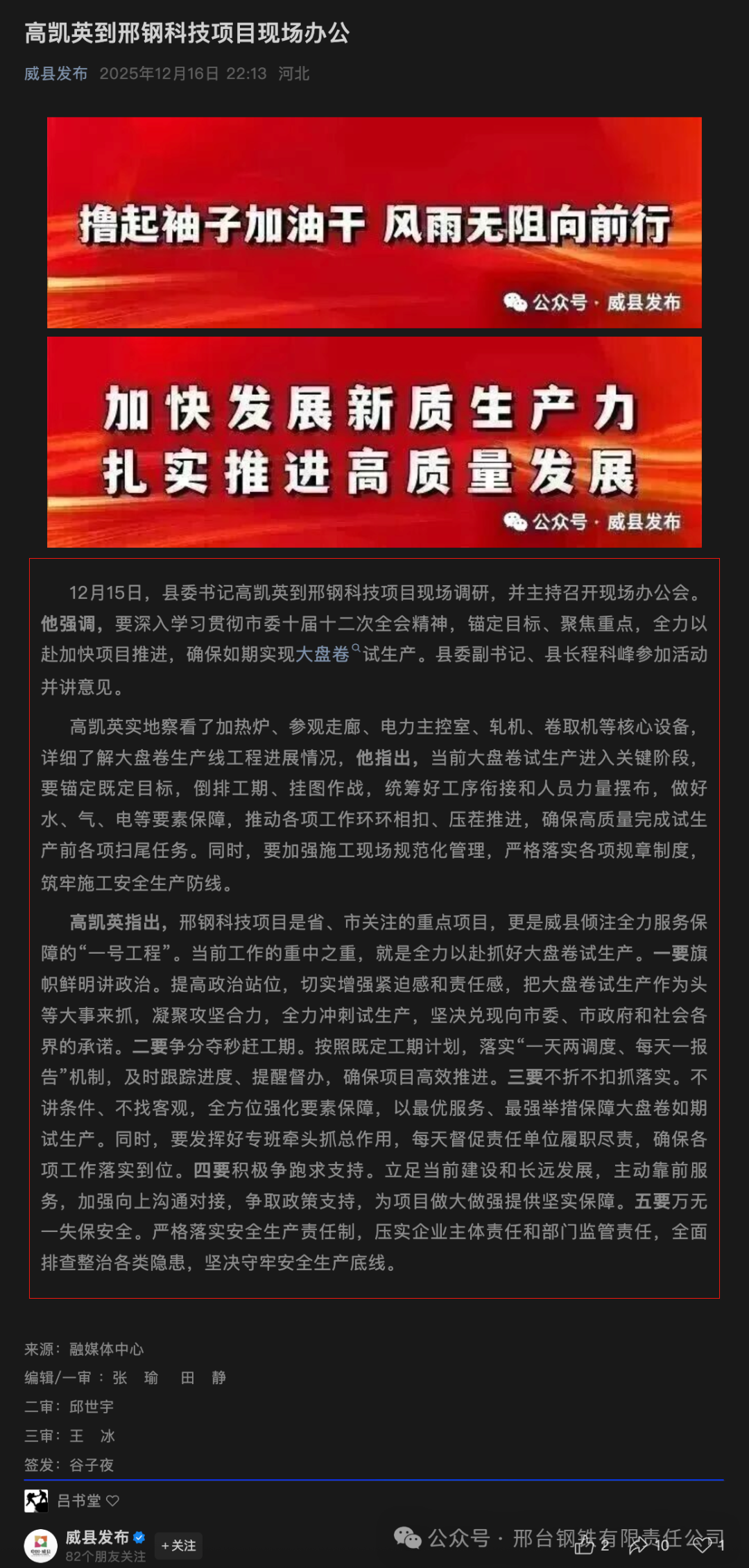 高凱英指出,邢鋼科技項(xiàng)目是省、市關(guān)注的重點(diǎn)項(xiàng)目,更是威縣傾注全力服務(wù)保障的“一號(hào)工程”。當(dāng)前工作的重中之重,就是全力以赴抓好大盤(pán)卷試生產(chǎn)。一要旗幟鮮明講政治。提高政治站位,切實(shí)增強(qiáng)緊迫感和責(zé)任感,把大盤(pán)卷試生產(chǎn)作為頭等大事來(lái)抓,凝聚攻堅(jiān)合力,全力沖刺試生產(chǎn),堅(jiān)決兌現(xiàn)向市委、市政府和社會(huì)各界的承諾。二要爭(zhēng)分奪秒趕工期。按照既定工期計(jì)劃,落實(shí)“一天兩調(diào)度、每天一報(bào)告”機(jī)制,及時(shí)跟蹤進(jìn)度、提醒督辦,確保項(xiàng)目高效推進(jìn)。三要不折不扣抓落實(shí)。不講條件、不找客觀,全方位強(qiáng)化要素保障,以最優(yōu)服務(wù)、最強(qiáng)舉措保障大盤(pán)卷如期試生產(chǎn)。同時(shí),要發(fā)揮好專(zhuān)班牽頭抓總作用,每天督促責(zé)任單位履職盡責(zé),確保各項(xiàng)工作落實(shí)到位。四要積極爭(zhēng)跑求支持。立足當(dāng)前建設(shè)和長(zhǎng)遠(yuǎn)發(fā)展,主動(dòng)靠前服務(wù),加強(qiáng)向上溝通對(duì)接,爭(zhēng)取政策支持,為項(xiàng)目做大做強(qiáng)提供堅(jiān)實(shí)保障。五要萬(wàn)無(wú)一失保安全。嚴(yán)格落實(shí)安全生產(chǎn)責(zé)任制,壓實(shí)企業(yè)主體責(zé)任和部門(mén)監(jiān)管責(zé)任,全面排查整治各類(lèi)隱患,堅(jiān)決守牢安全生產(chǎn)底線。